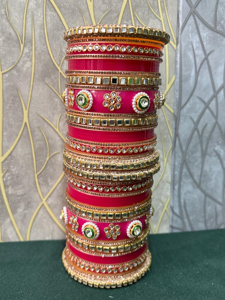 Made with high-class materials, vibrant shades, and smooth finesse, it stays stunning throughout your celebrations. Whether it’s your wedding day, pre-wedding shoot, or rituals, this bridal choora adds the perfect royal touch.