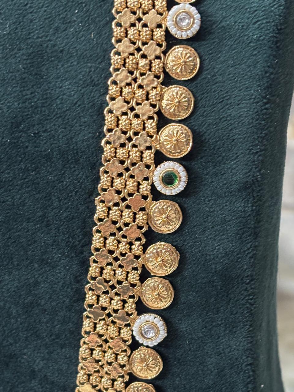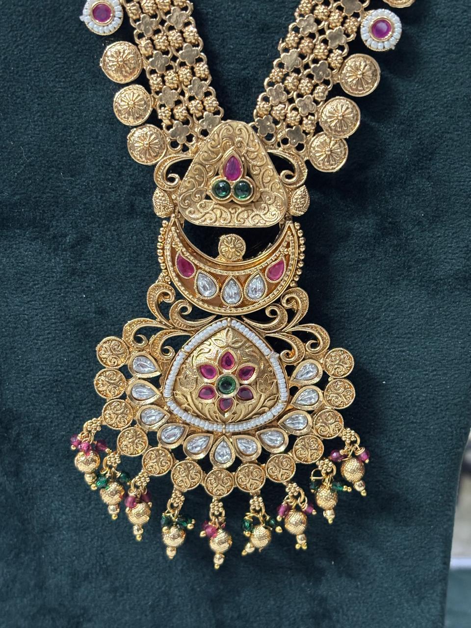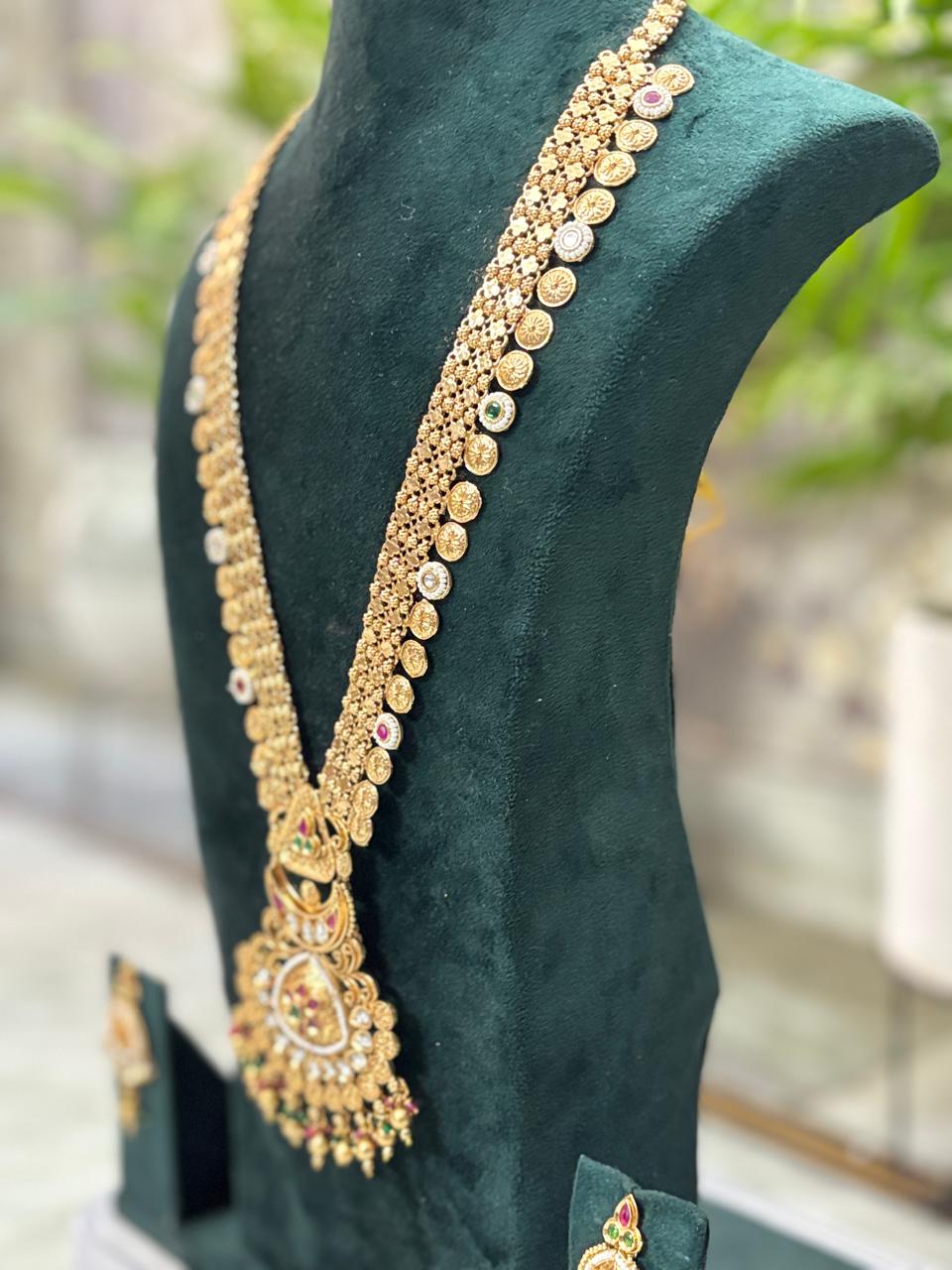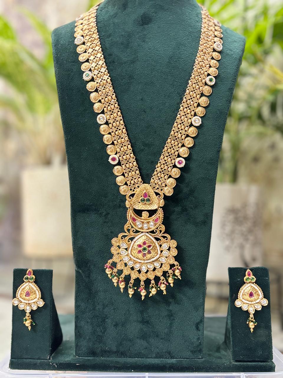 traditional ranihaar set, heritage long necklace, bridal ranihaar, lifetime colour guarantee jewelry, Mahalaxmi Emporium jewelry, antique long haar set, wedding long necklace.